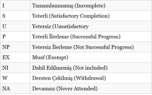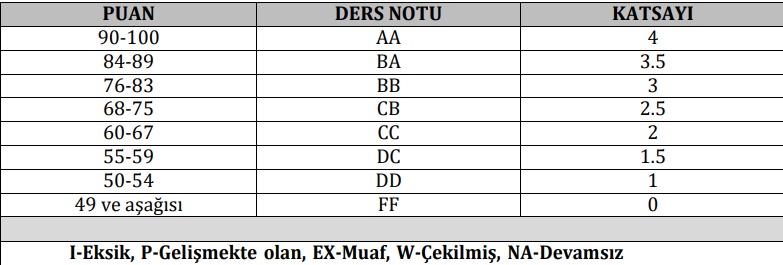 Aşağıdaki tablo harf notları, ağırlıkları ve AKTS denkliği hakkında bilgi vermektedir: