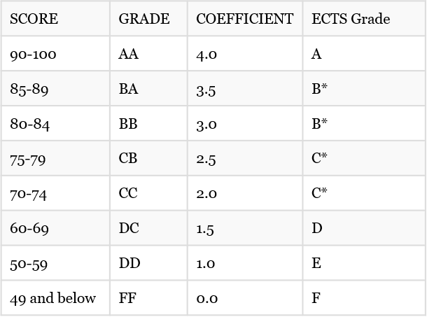 In order to be successful in a course, short cycle (associate degree) and first cycle (bachelor’s degree) students have to get a grade of at least DD, second cycle (master’s degree) students have to get a grade of at least CC, and third cycle (Ph.D.) students have to get a grade of at least CB to pass a course. For courses that are not included in the cumulative GPA, students need to get a grade of S.